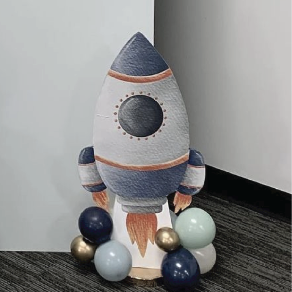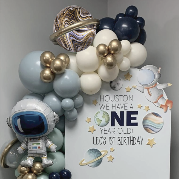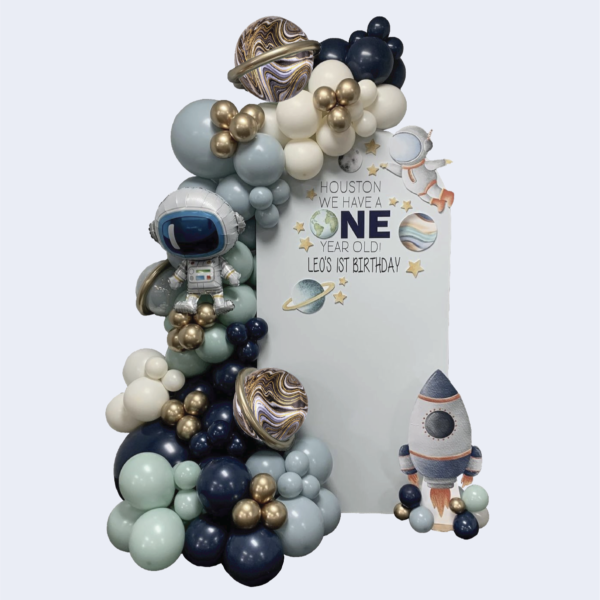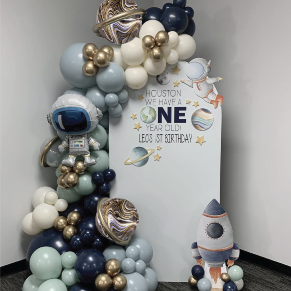 Featuring rockets, astronauts, and planets, this cosmic-themed setup is perfect for little explorers and space lovers. With bold colors like navy, muted blue and gold, it’s the ultimate backdrop for a stellar party!